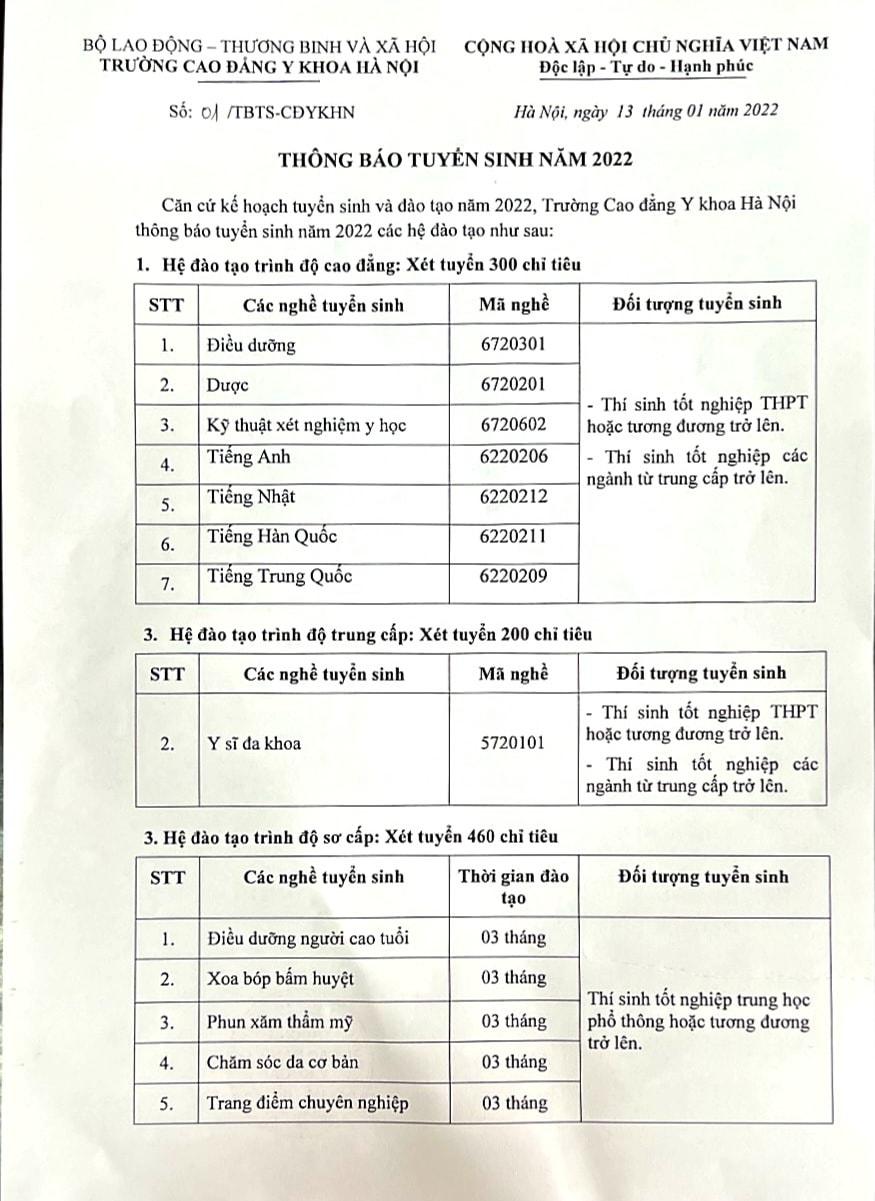 Căn cứ kế hoạch tuyển sinh và đào tạo năm 2021, trường Cao đẳng Y Khoa Hà Nội thông báo tuyển sinh các hệ đào tạo theo hình thức xét tuyển. Cụ...
