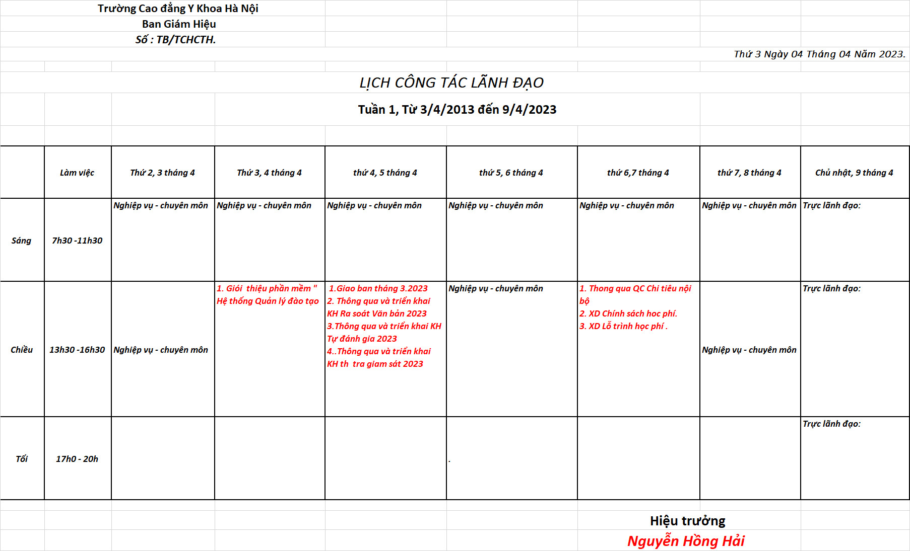 LỊCH CÔNG TÁC LÃNH ĐẠO TUẦN 1 THÁNG 4
